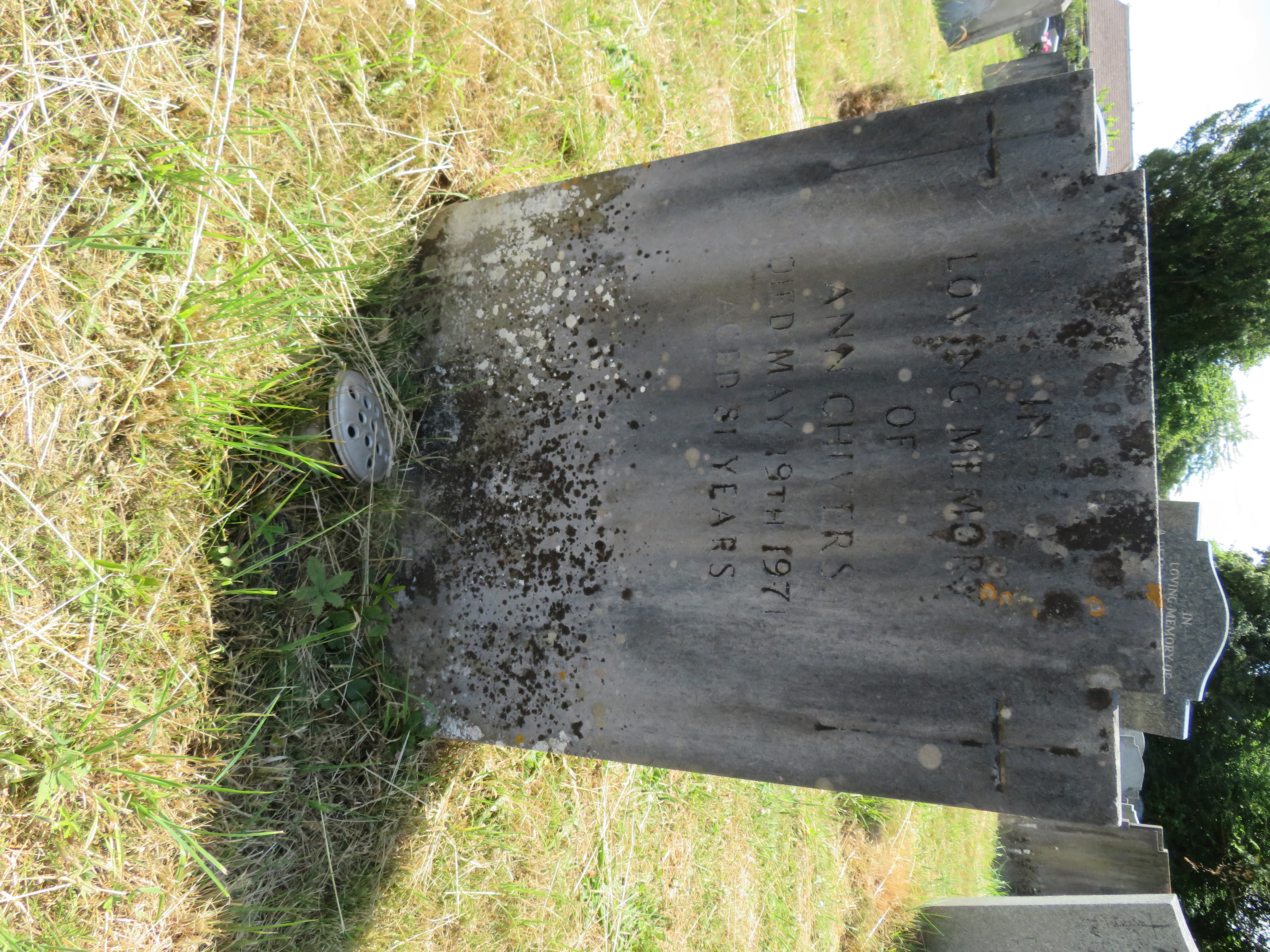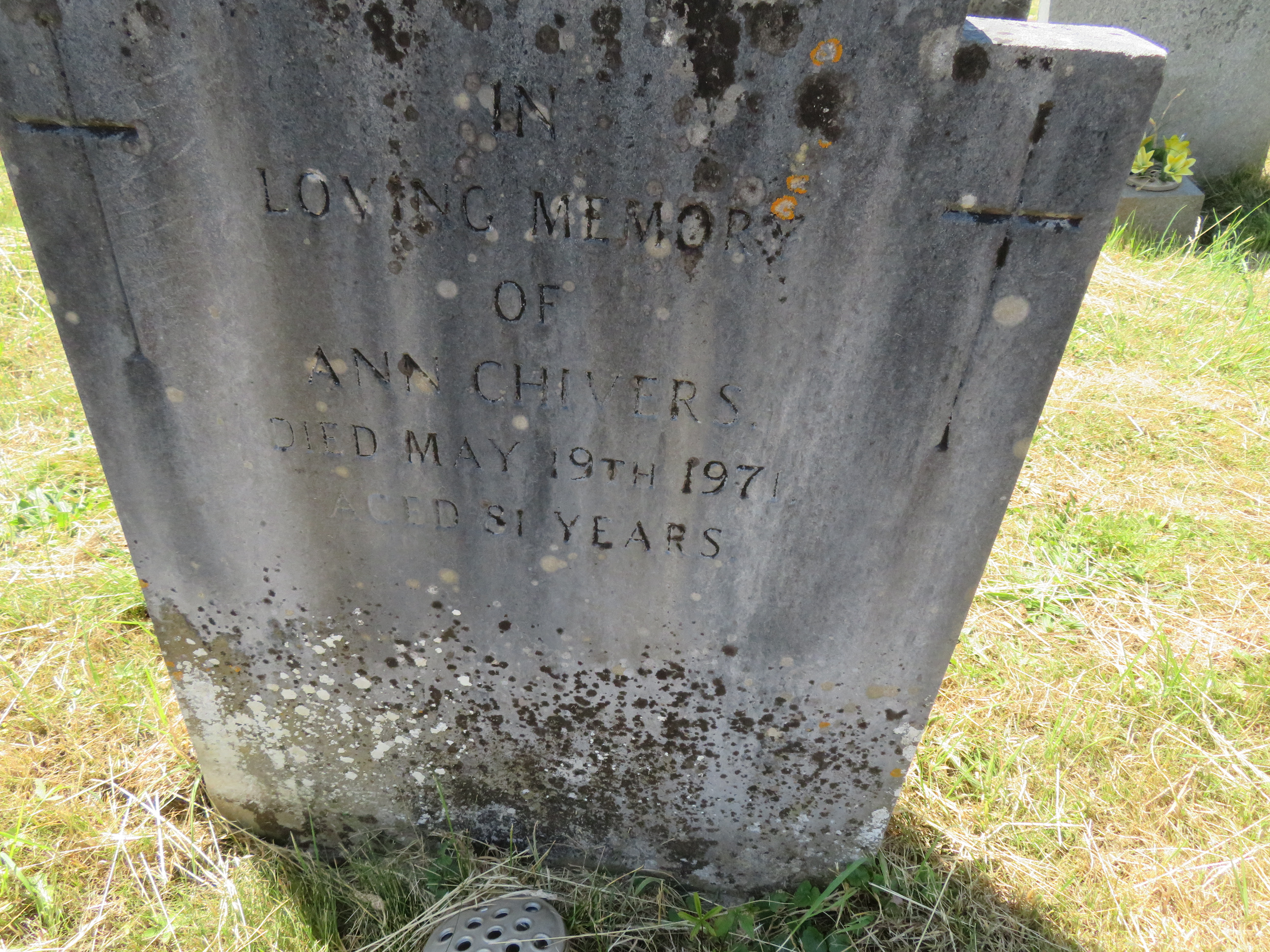 Row One Personal information Surname Chivers Forenames Ann Born (approx) 1889 Age 81 Died 19-May-1971 Buried 24-May-1971 Row Two Burial details Cemetery id Midsomer Norton Plot Reference N.HH.32 Monumental Inscription MI Burial B Burial images Popup Popup Enlarge images Other burials in this plot Component Wrapper Other burials in this plot